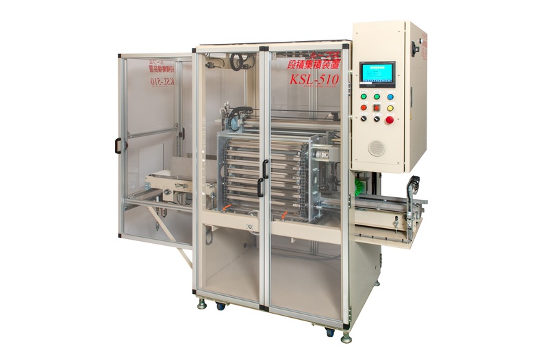 小箱を指定の列・段数に高速で段積みし、スリーブ包装機へと排出します。